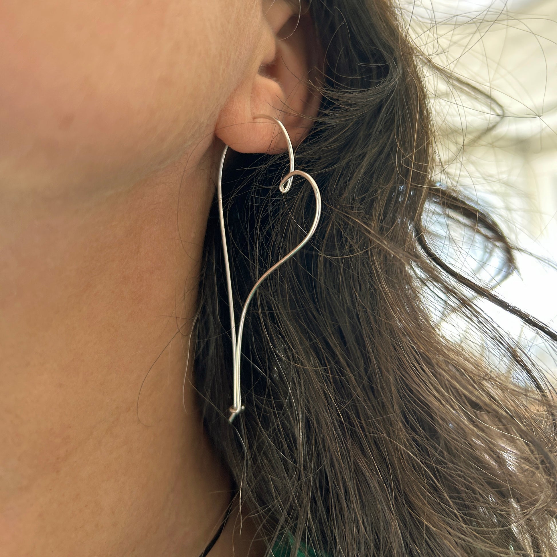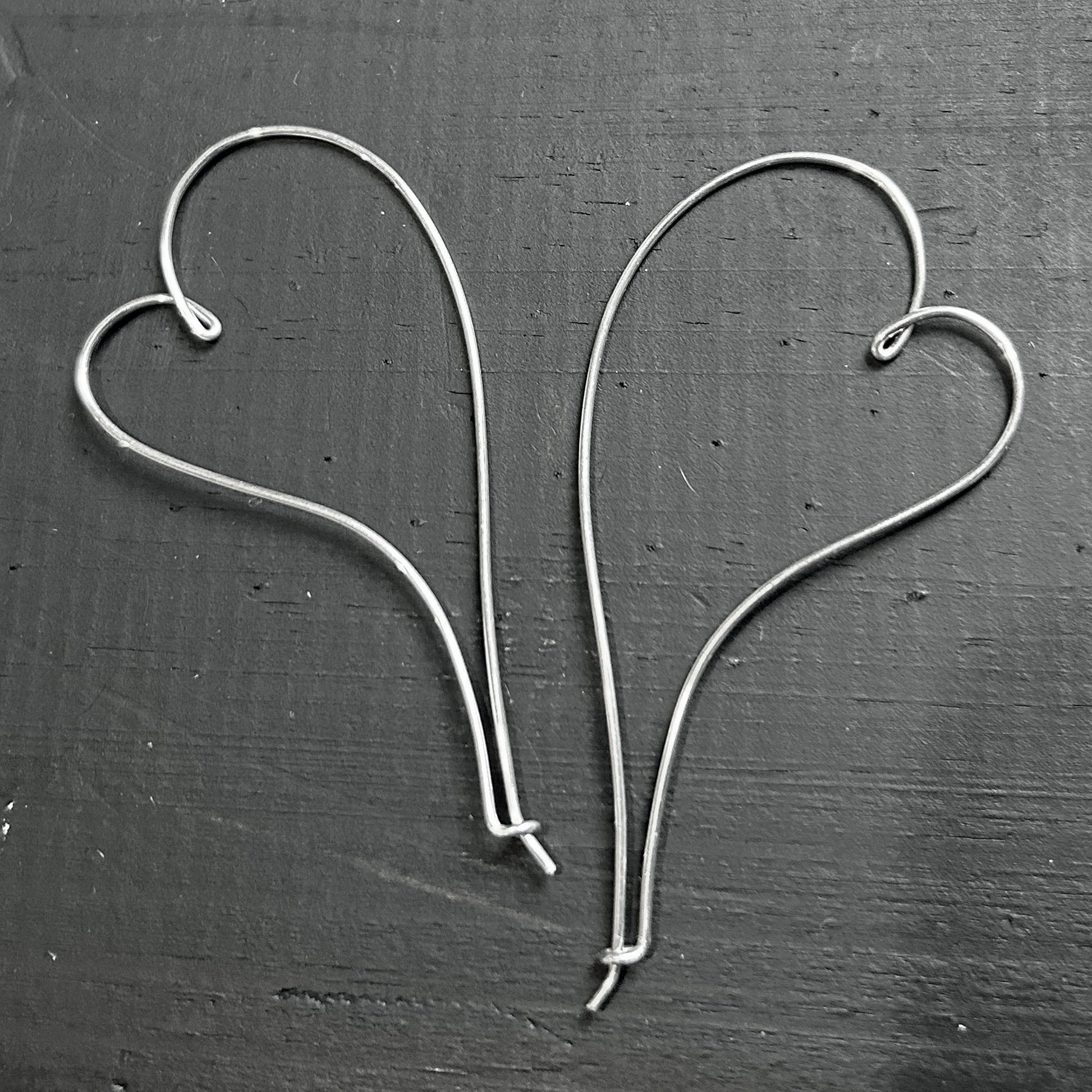 These melting heart hoop-style threader earrings are part of the minimalist geometric earrings collection. They're lightweight, stylish, and go with everything! Hand-shaped with 18 gauge wire (slightly thicker than most ear wires), and available in sterling, 14K gold filled, and 14K rose-gold filled metals. Earrings measure approximately 2" X 0.75"